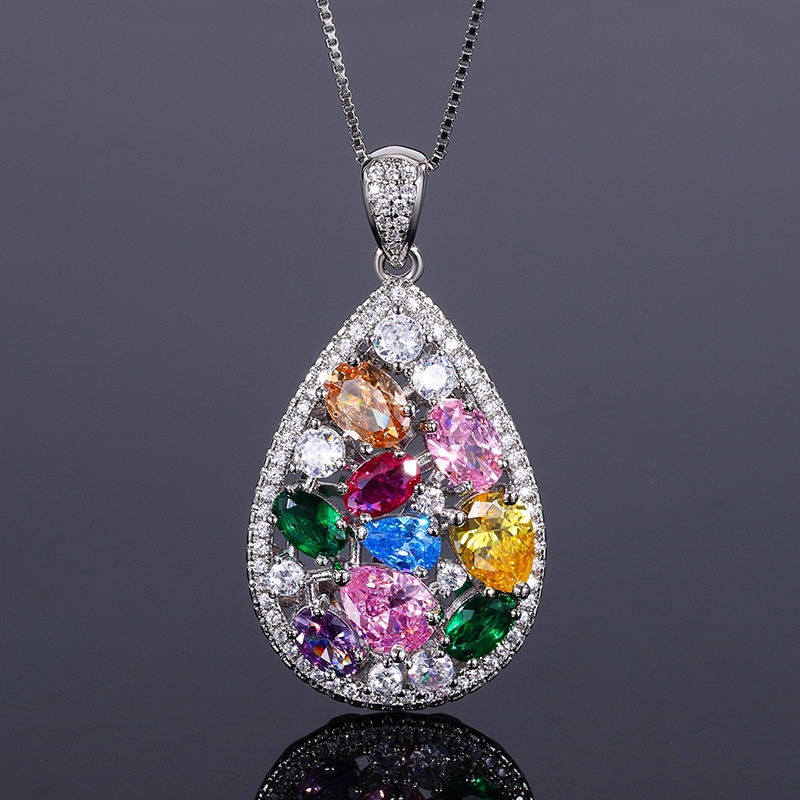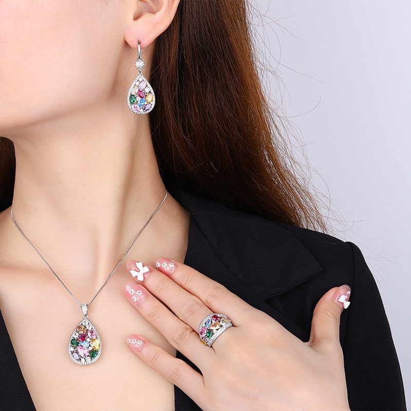 S22741 S925 silver rainbow water drops gemstone zircon earrings, ring and necklace set