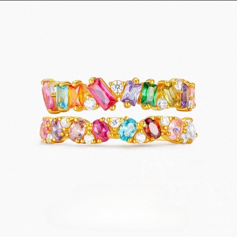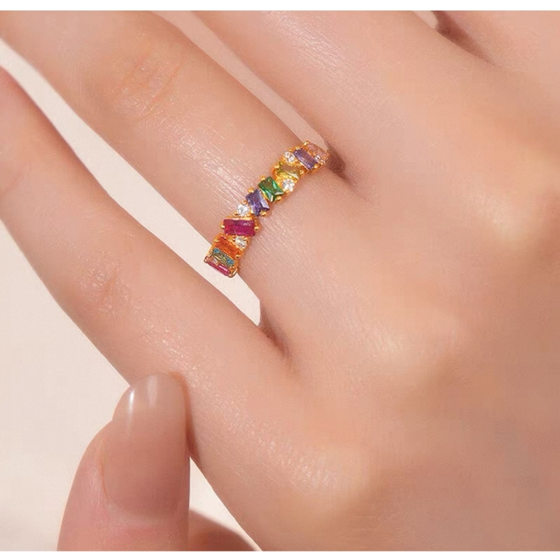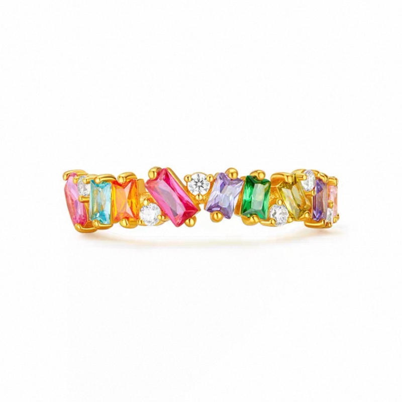 Radiating vibrant charm, this S925 silver ring plated in yellow gold features a dazzling array of inlaid rainbow zircons. Its sleek band and vivid sparkle evoke joy and individuality, perfect for adding a pop of color to any look. A playful yet elegant statement piece that celebrates self-expression with every shimmering hue.
