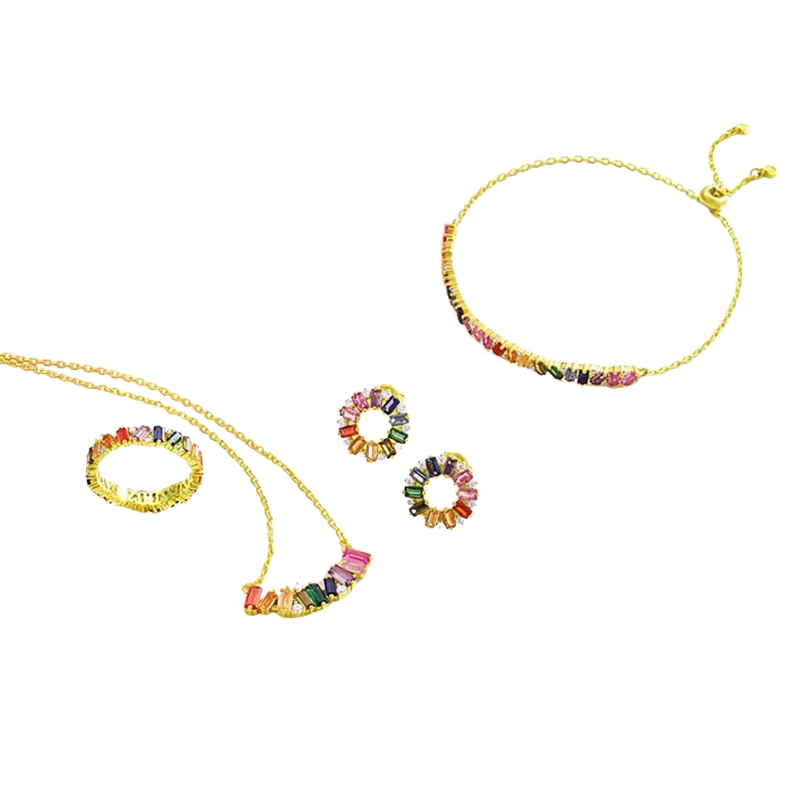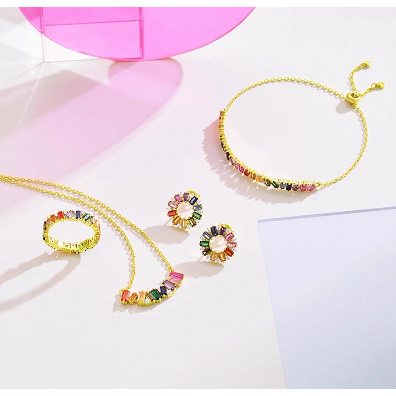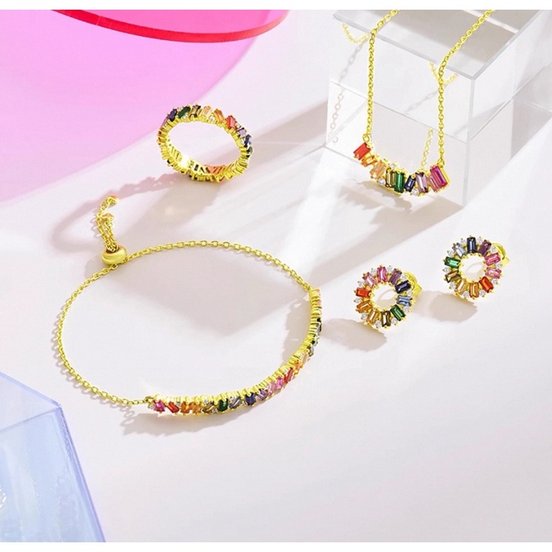 Radiate elegance with this S925 silver jewelry set, featuring dazzling multi-colored zircon stones that capture light and attention. The necklace, earrings, and ring blend vibrant hues with timeless craftsmanship, perfect for adding sparkle to any occasion. Hypoallergenic and tarnish-resistant, this set offers lasting beauty and charm for those who love color with sophistication.